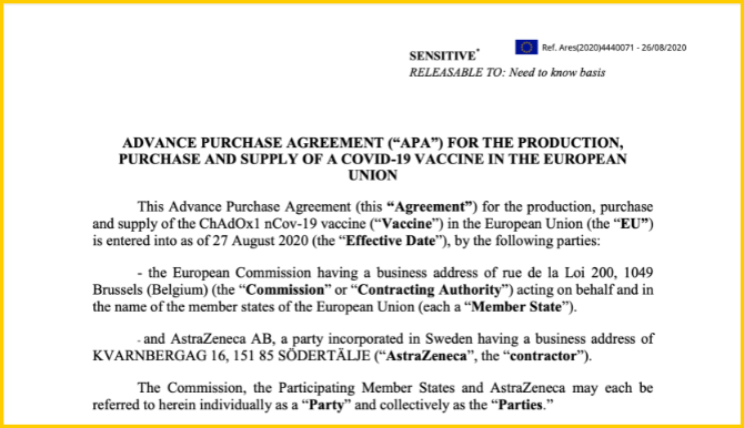 1月29日,欧盟公布了从2020年8月27日开始生效的预先采购协议文本。尽管协议中部分保密信息被隐去,但协议本身仍能够解答外界的不少疑问。