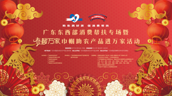 广东省举办以“购东西好货 促消费帮扶”为主题的广东农产品“保供稳价安心”数字平台——2021迎春网络年货节广东东西部消费帮扶专场暨“春暖万家”巾帼助农产品进万家活动,旨在让年货“触手可及”,让年味“分毫不减”,更让爱心“永不独行”,通过消费帮扶,推动更多农户收入增长,共享节日喜悦。