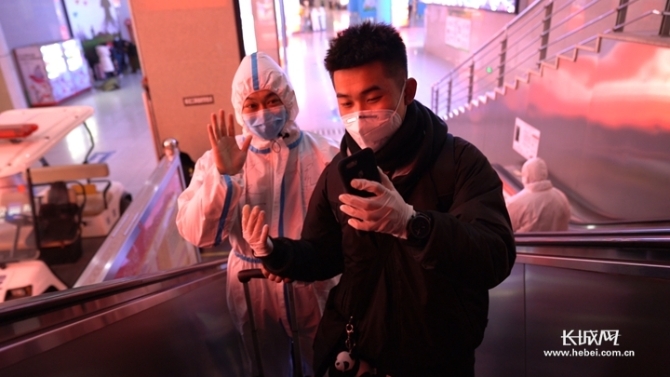 石家庄站西广场,薛兆宇(右)与母亲打视频电话,家人隔屏感谢倪庆德(左)。长城网记者 冯硕 摄