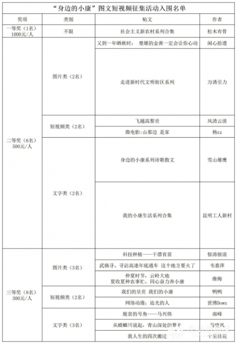 经过评委研议,最终共有15个参赛作品脱颖而出,荣获年度奖项。其中,网友“松木有骨”的作品《社会主义新农村》系列合集记录下他走访过的50多个云南农村,通过一张张生动的摄影作品展现了云南农村、农业、农民的深刻变化和崭新面貌,荣获一等奖;网友“风清云淡”的短视频作品《飞越高黎贡》展现了高黎贡山下公路沿线富饶美丽的景色,那一条条冲出大山的泊油公路,延伸了这里居民的小康之路,荣获二等奖;网友“世博Down”的作品《网络动漫:追光的人》用年轻人喜欢的动漫形式,以3位扶贫干部的视角讲述了沧源佤族自治县正式脱贫摘帽中的故事,荣获三等奖;网友“昆明工人新村”的《百味人生菜市场》、网友“十里桂花”的作品《我人生的四次搬迁》则通过菜市场、搬家等身边的变化,以“小”见证人民的幸福生活。