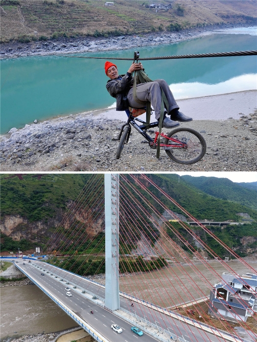 拼版照片上图:2013年2月2日,在怒江傈僳族自治州泸水县六库镇双米地村辣子咪村民小组,一名傈僳族男子带着自行车溜索过怒江(新华社记者 蔺以光 摄);下图:2016年9月9日拍摄的怒江傈僳族自治州的双向六车道大型公路跨江桥梁——通达桥(新华社记者 胡超/摄)。新华社发