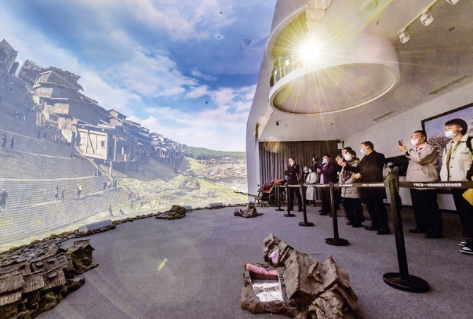 近年来,重庆红岩革命纪念馆以新技术把革命文物搬上屏幕和舞台,创新革命文物展示,让红岩革命文物“活”起来。图为在重庆红岩革命纪念馆“红岩记忆”数字体验厅内,观众们观看以双曲三维穹幕技术展示的场景。新华社记者李贺/摄
