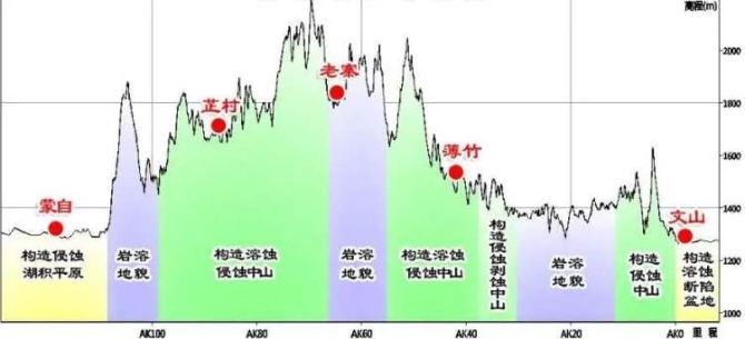 线路走行于云贵高原南缘,东西两端分别为文山构造溶蚀断陷盆地和蒙自构造侵蚀湖积平原,中部为中山山地高原地貌,分布有复杂多变的岩溶地貌景观。全线存在地形高差大,地质构造发育,可溶岩分布广泛,岩溶形态丰富,地下暗河发育等特点,总体组在20余天里反复踏勘优化方案,截至过程指导前已开放全线及局部比较方案50余个。