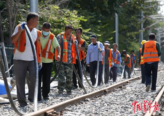 2020年9月22日,京哈高铁北京朝阳站附近,京哈高铁北京至承德段进入最后的施工建设阶段,工人们正在铺设电缆。中青报·中青网记者 陈剑/摄