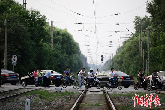 2015年7月7日,北京东四环外,星火站沿京包线往北不远处,车辆和行人经过铁路道口。中青报·中青网记者 陈剑/摄