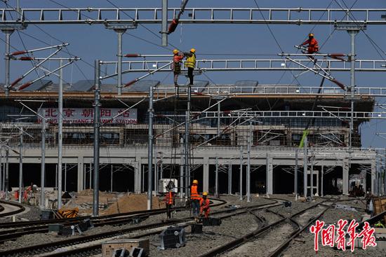 2020年9月22日,北京朝阳站建设工地附近,工人正在架设接触网。中青报·中青网记者 陈剑/摄