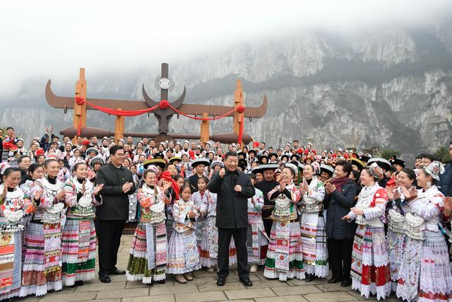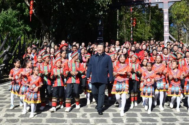 ↑2020年1月19日,云南腾冲市清水乡三家村中寨司莫拉佤族村的乡亲们唱着《阿佤人民唱新歌》,簇拥着习近平走出村口。