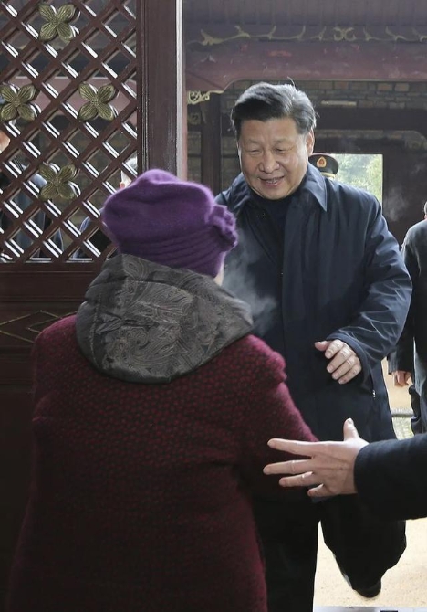 ↑2016年2月2日,习近平在江西井冈山八角楼革命旧址群看望革命烈士后代和先进人物代表,同他们亲切交谈。