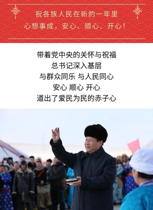 ↑2014年1月27日,在内蒙古锡林浩特市宝力根苏木(乡)冬季那达慕“五畜祈福”仪式上,习近平按照蒙古族习俗,用无名指蘸上银碗盛着的鲜牛奶弹了三下,祝福来年风调雨顺,五畜兴旺,人民幸福安康。