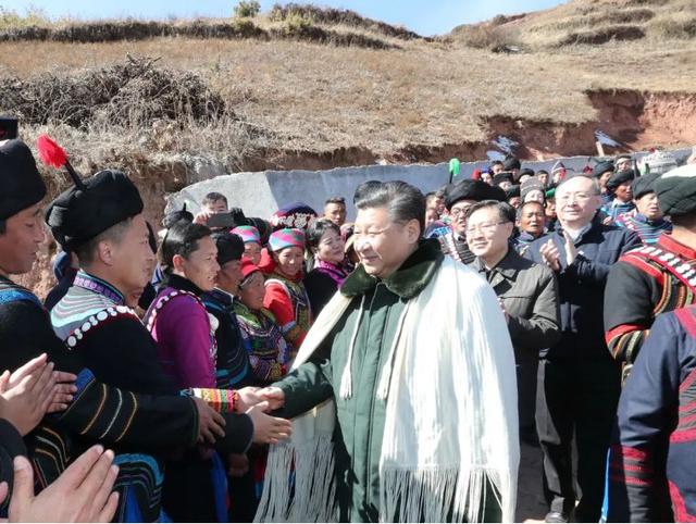 ↑2018年2月11日,习近平在四川凉山彝族自治州昭觉县解放乡易地扶贫搬迁新村火普村同乡亲们亲切握手。