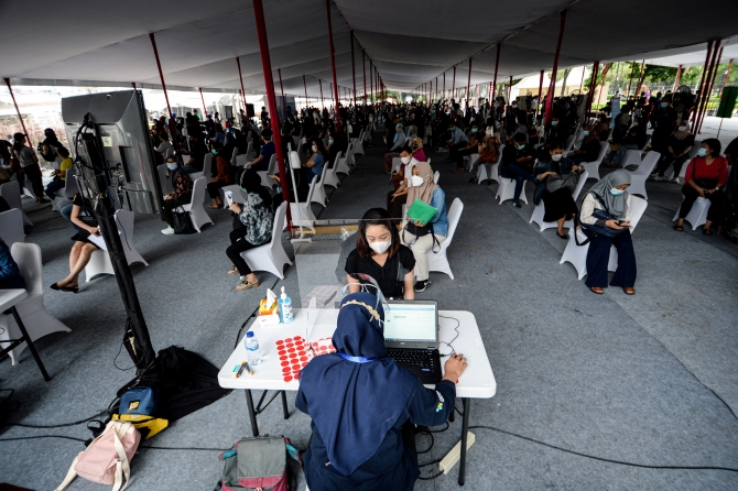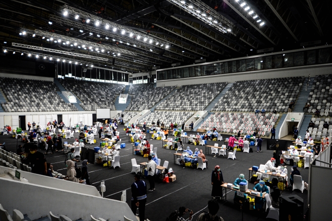 ↑ 2月4日,医务工作者在印度尼西亚雅加达等待接种中国科兴公司的新冠疫苗。↓