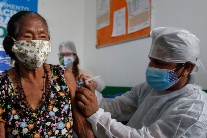 1月19日,在巴西亚马孙州塔巴廷加市,医护人员为一名原住民接种中国新冠疫苗。新华社发(卢西奥·塔沃拉摄)