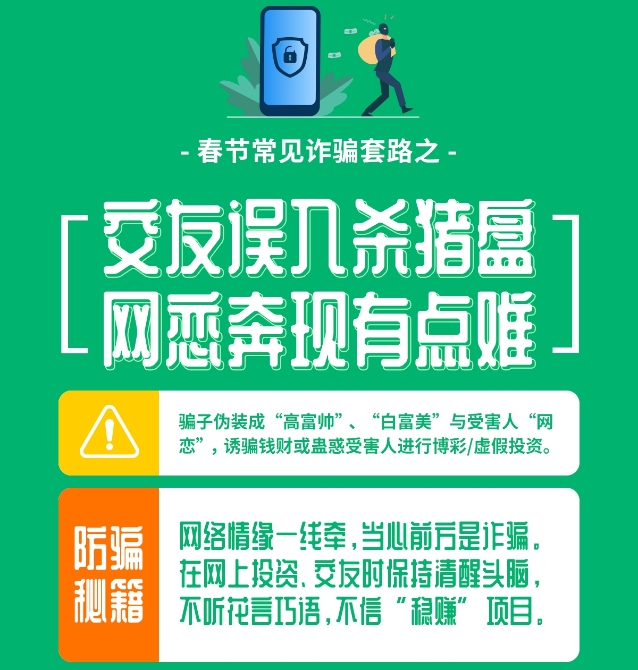 防骗秘籍:网络一线牵,当心是诈骗。在网上投资、交友时记得保持清醒的头脑,不要因为对方的花言巧语而放松警惕,更不要相信所谓的“稳赚”项目,避免成为骗子砧板上的“待杀猪仔”。