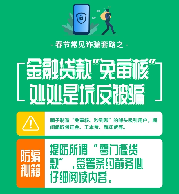 防骗秘籍:先交钱再放款必有诈。无需担保抵押、手续简单、到账快、利息低……贷款诈骗总是以各种噱头来“钓鱼”,银行和正规贷款公司都不会要求借款人预先支付手续费等各类费用,所以任何要求事先支付资金的都是骗子,切勿上当。
