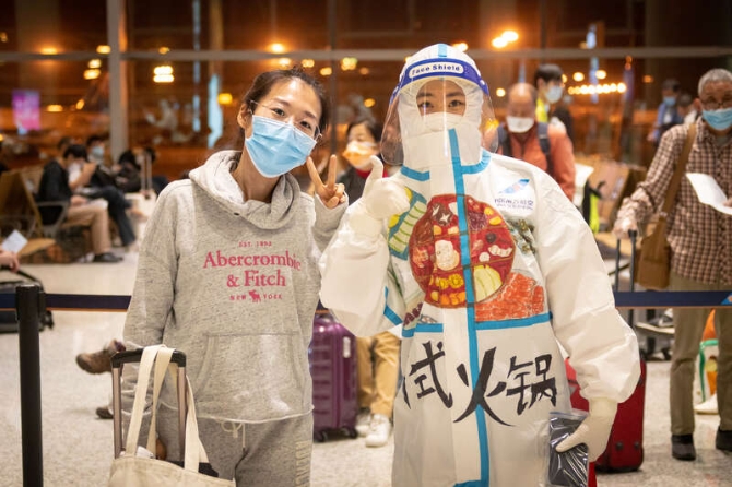 老家在四川的谢春,防护服上绘制的是麻辣火锅。(摄影:辛阳)