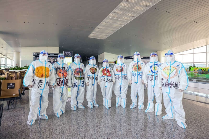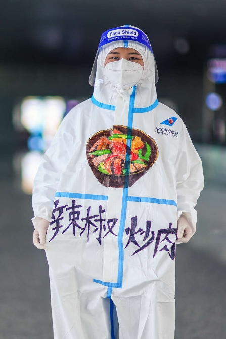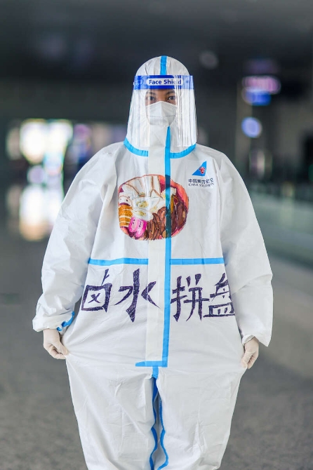 由于回国航班上大多数旅客是华人,负责保障国际进港航班的南方航空地面服务工作人员,用小小的画笔把各自老家的年夜饭画上防护服。他们希望通过这种方式,给旅客送上节日的祝福,让他们感受浓厚的“年味”。