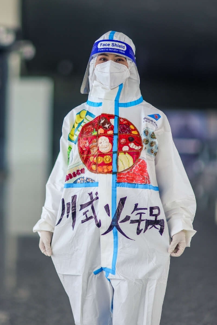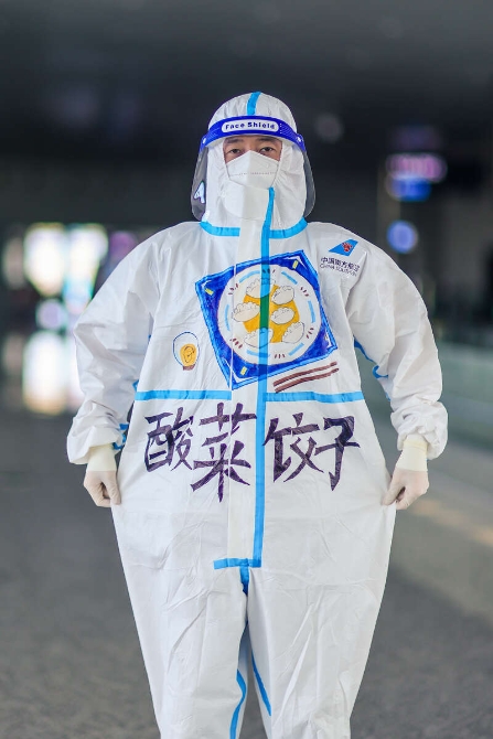 潘瑜来自江苏,今年是她在岗位上度过的第10个春节。在岗位上度过春节,已成为大多数民航人的常态,但今年因为疫情常态化防控和“就地过年”的倡议,让春节的坚守更多了一份责任和特殊的意义。潘瑜说,“在防护服上画上大闸蟹、火锅、炸素丸子等家乡菜,用这种特殊的方式来表达我们对故乡和家人的牵挂。”