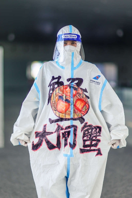 老家在江苏的潘瑜,防护服上绘制的是大闸蟹。(摄影:辛阳)