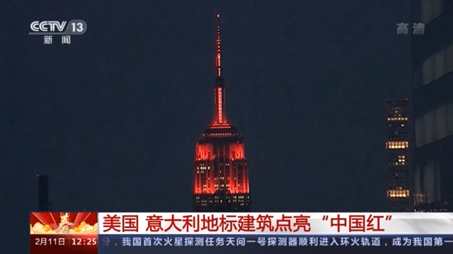 10日,美国纽约的地标性建筑“帝国大厦”,在春节来临前亮起红色灯光,表达新春的祝福。