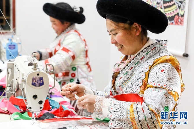 贵州毕节市黔西县新仁苗族乡化屋村村民在扶贫车间内加工衣服(2月3日摄)。新华社记者 欧东衢 摄