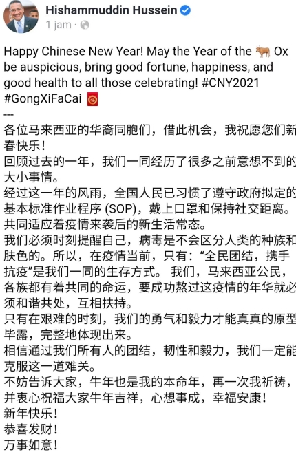 2月11日,马来西亚外交部长外长希沙姆丁通过社交媒体平台向大马华裔民众祝贺新春佳节。他呼吁“全民团结 携手抗疫”,并说“我也属牛!”(总台记者 徐荃乐)