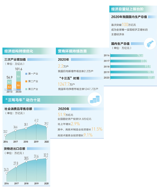 从2016年至2018年经济总量相继突破70万亿元、80万亿元、90万亿元大关,再到2020年我国成为全球唯一实现经济正增长的主要经济体,国内生产总值历史上首次突破100万亿元……“十三五”时期,国内生产总值年均名义增量达到6.5万亿元,比“十二五”时期增加1.0万亿元,中国经济总量稳居世界第二。2020年,我国人均GDP连续第二年超过1万美元,与高收入国家发展的差距继续缩小。
