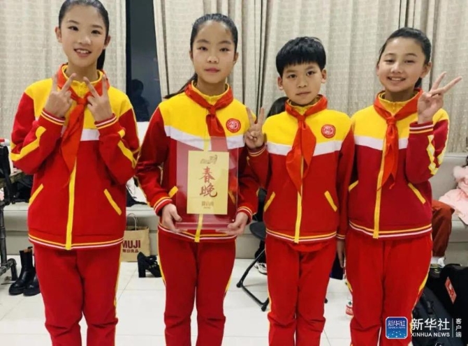 湖南省祁东县启航学校留守儿童合唱团的张焱林、肖恩、周诗琪、陈雨馨在央视春晚舞台上表演节目《明天会更好》(视频截图)。