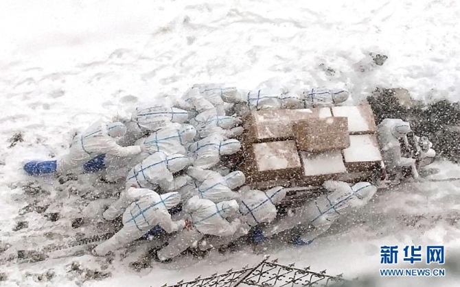 大连海洋大学的志愿者们推着满载的三轮车上坡,将物资送到学生宿舍。1月6日,这个画面在互联网上广泛传播,感动了万千网友。新华社发(大连海洋大学供图)