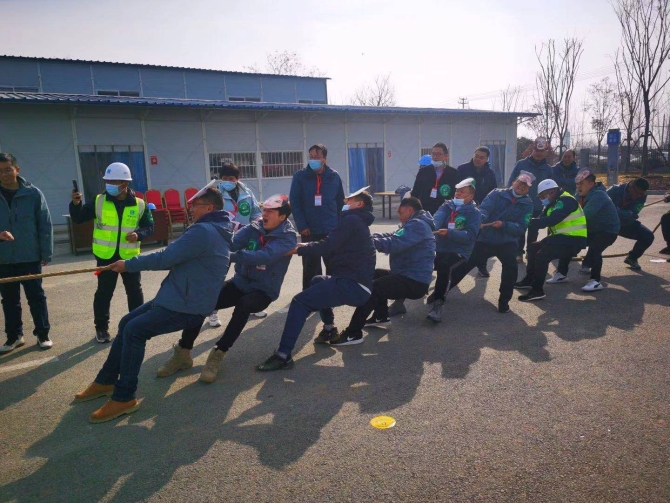大年三十早上9点多,中建三局徐州园博园项目上便热闹起来,留守工友们欢聚一起,展开趣味拔河比赛,相互鼓劲中欢声笑语不断。不远处的空地上,已搭起喜庆的大舞台,五彩气球簇拥,午饭后工友们上台各展才艺,表演歌舞、小品等节目,整个项目工地过年氛围浓厚。