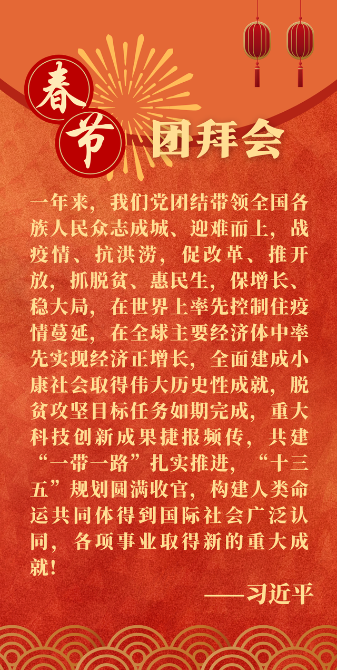 2月10日上午,中共中央、国务院在人民大会堂举行2021年春节团拜会。中共中央总书记、国家主席、中央军委主席习近平发表讲话,代表党中央、国务院,向全国各族人民,向香港特别行政区同胞、澳门特别行政区同胞、台湾同胞和海外侨胞拜年。