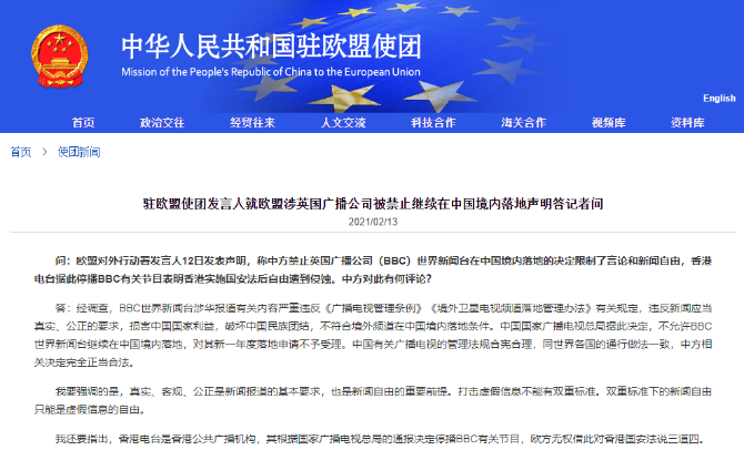 中国驻欧盟使团发言人就欧盟涉英国广播公司被禁止继续在中国境内落地声明答记者问