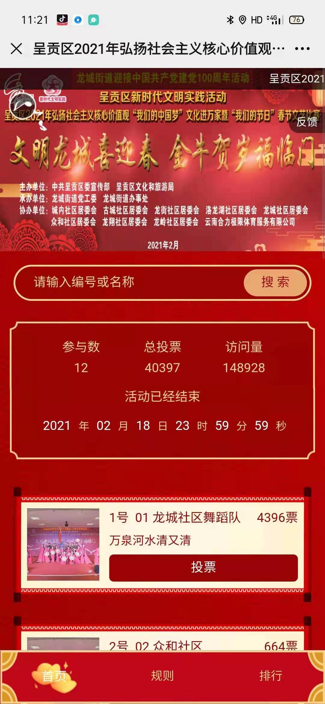 截止2021年2月18日24时,活动点击率148928,总投票40397次。此次比赛设置一等奖1个,二等奖3个,三等奖5个,组织奖3个。经过七天的角逐,洛龙湖社区报送的歌舞节目《盛世欢歌献给党》得到10460票,得票最高。此次活动意在丰富群众精神文化活动,提高大家的幸福感、获得感,让辖区居民就地过年,暖在心中。