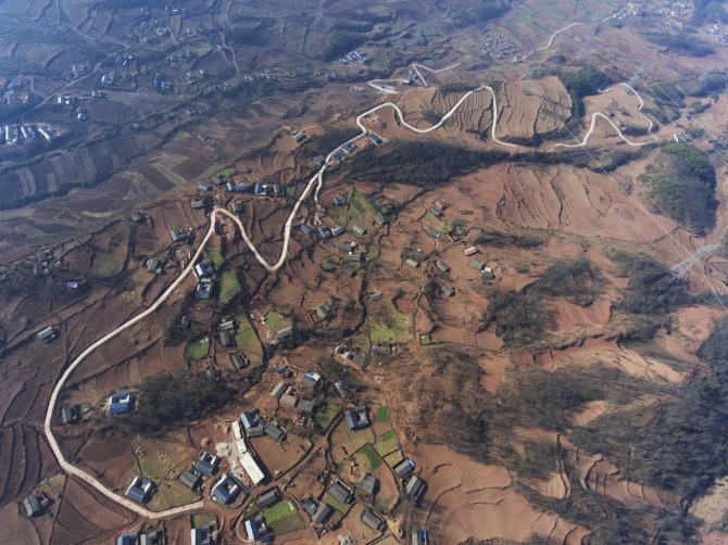 这是四川省凉山彝族自治州美姑县九口乡四峨吉村约6公里的道路硬化项目(2017年2月12日摄,无人机照片)。2015年8月,蒋富安由凉山州审计局派到美姑县九口乡四峨吉村任驻村第一书记,2016年8月22日因劳累猝死,年仅26岁。新华社记者 刘坤 摄