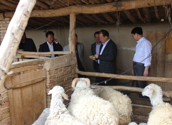 柴生芳(右二)在甘肃省临洮县八里铺镇检查畜牧养殖合作社发展情况(资料照片)。新华社发