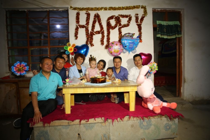 席世明(左二)和其他援疆干部一同给维吾尔族小姑娘“小石榴”过生日(资料照片)。新华社发