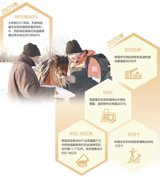 国家邮政局明确提出,继续深入推进“快递进村”,力争到2021年底,东部地区基本实现快递服务直投到村,中、西部地区建制村快递服务通达率分别达80%和60%。(人民日报 记者李心萍 祝佳祺)