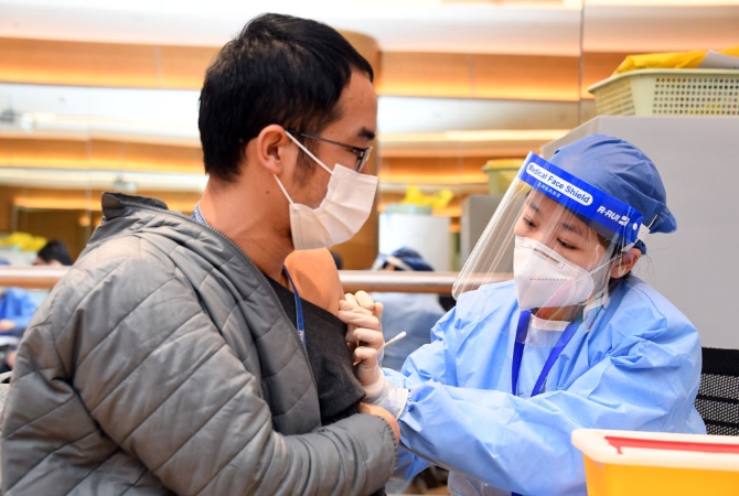 2月22日,在北京市海淀区中关村软件园二期一家企业内的临时接种点,医务人员为企业员工接种新冠疫苗。新华社记者 任超 摄