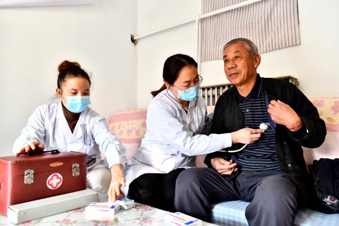 2020年11月11日,在山东省潍坊市寒亭区寒亭街道东院社区,卫生室医生王红霞(中)为村民张勇臣看病。寒亭区探索实施医保服务下沉举措,构建起覆盖全区基层医疗机构的医保服务下沉网络,让群众在家门口便捷地享受医保红利。新华社记者 郭绪雷 摄