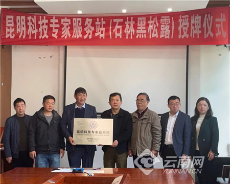 3月3日,昆明科技专家服务站授牌仪式在石林彝族自治县鹿阜镇镇阿乌村委会大黑塘村云南融奥经贸有限公司石林块菌(黑松露)实验示范科普基地举行,这也是昆明市科协授予石林县的首个科技专家服务站。