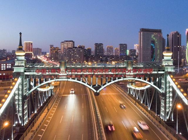 中国(黑龙江)自由贸易试验区哈尔滨片区自挂牌运行以来,重点发展新一代信息技术、新材料、高端装备、生物医药等战略性新兴产业,有序推进科技、金融、文化旅游等现代服务业和寒地冰雪经济,建设对俄罗斯及东北亚全面合作的承载高地和联通国内、辐射欧亚的国家物流枢纽,打造东北全面振兴全方位振兴的增长极和示范区。这是位于阳明滩大桥上的中国(黑龙江)自由贸易试验区哈尔滨片区“大门”(2020年11月13日摄,无人机照片)。