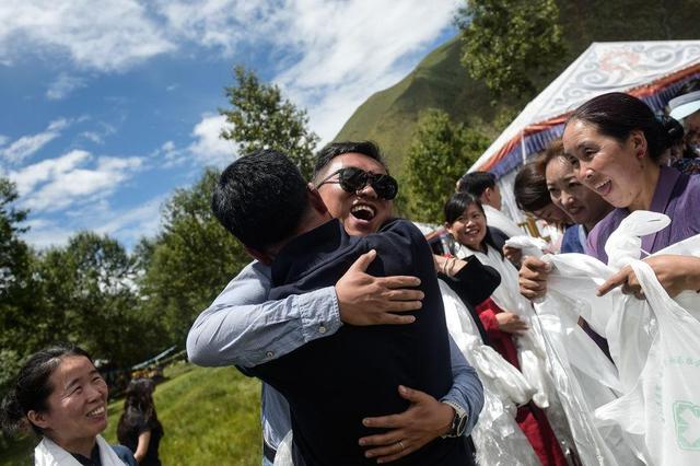 2015年以来,北京援藏医疗队以“组团式”医疗援藏为抓手,帮助拉萨市人民医院新建了急诊科、重症医学科等12个学科,推动当地医疗事业发生格局性变化。如今,“组团式”医疗援助已经成为北京在助力脱贫攻坚战中一张闪亮的名片。这是在西藏拉萨市达孜区,北京大学肿瘤医院的援藏医生袁灿(戴墨镜者)与送别的藏族同事拥抱(2020年8月1日摄)。
