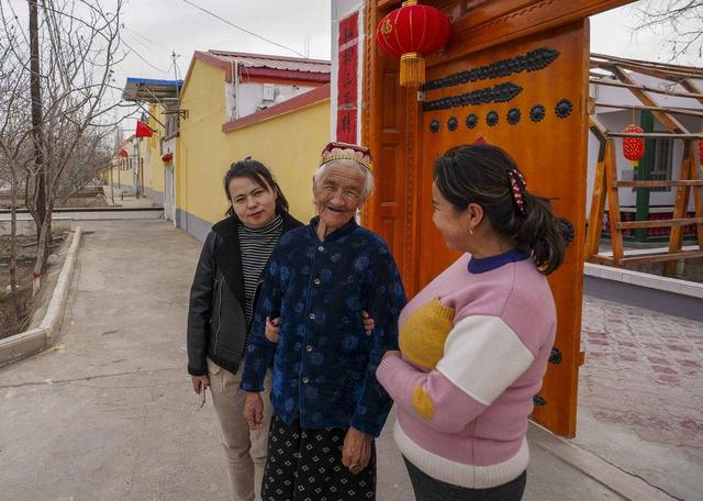 在和田地区于田县先拜巴扎镇良种场村,库尔班·吐鲁木的女儿托乎提汗·库尔班(中)与家人一道在院门口散步(2019年2月13日摄)。