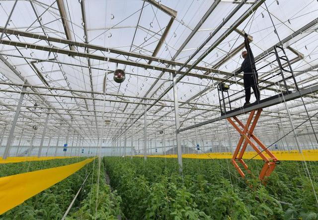 山东聊城茌平区贾寨镇耿店村从上世纪90年代开始农业大棚种植。如今,耿店村拥有了现代化的蔬菜大棚,年产蔬菜上万吨,村容村貌也随之得到了极大改善,吸引了许多在外打工的年轻村民带着新思想、新业态、新技术回乡建棚种菜,当起了“棚二代”,成为耿店村发展振兴的主力军。这是在耿店村的现代化玻璃温室内,一位村民使用升降设备进行田间养护(2020年10月20日摄)。