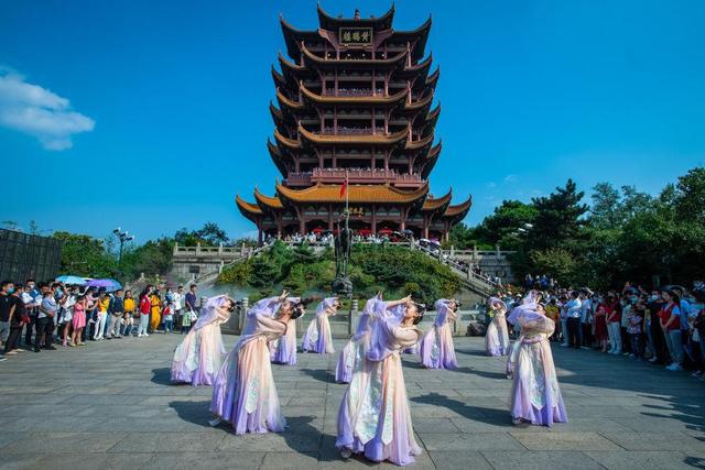 2020年国庆黄金周,湖北30家重点景区累计接待游客207.11万人次,实现旅游综合收入2.05亿元。黄鹤楼位列国内景区热度榜首位。这是游客在湖北武汉黄鹤楼景区观看演出(2020年10月1日摄)。