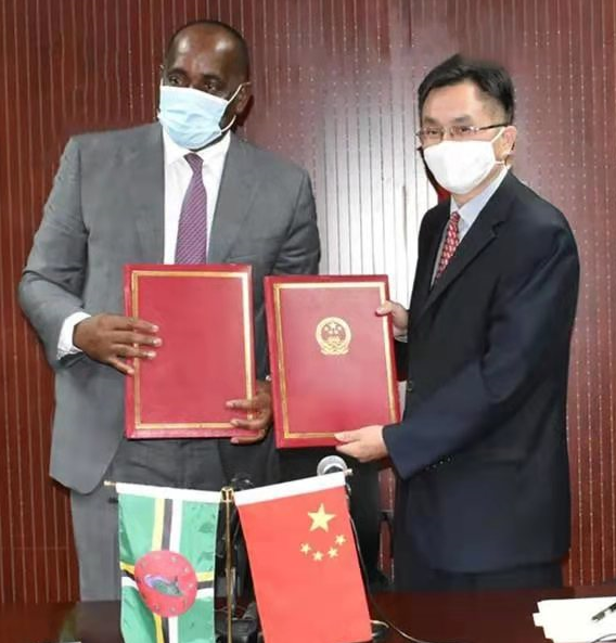 斯凯里特和罗松涛交接疫苗(图片由驻多米尼克使馆提供)