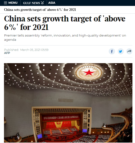 当地时间3月5日,阿联酋发行量居首位的英文报纸《海湾新闻》发表题为《中国为2021年设定经济增长目标为6%以上》的文章,对今年政府工作报告进行了关注。