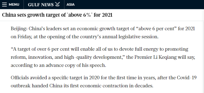 文章表示,5日两会政府工作报告中宣布,中国在2021年的经济增长目标为6%以上,并强调要努力推动改革、创新和高质量发展。文章还指出,在全球遭受疫情冲击的背景下,中国采取的抗疫举措卓有成效,作为全球第二大经济体,中国经济有望持续复苏。