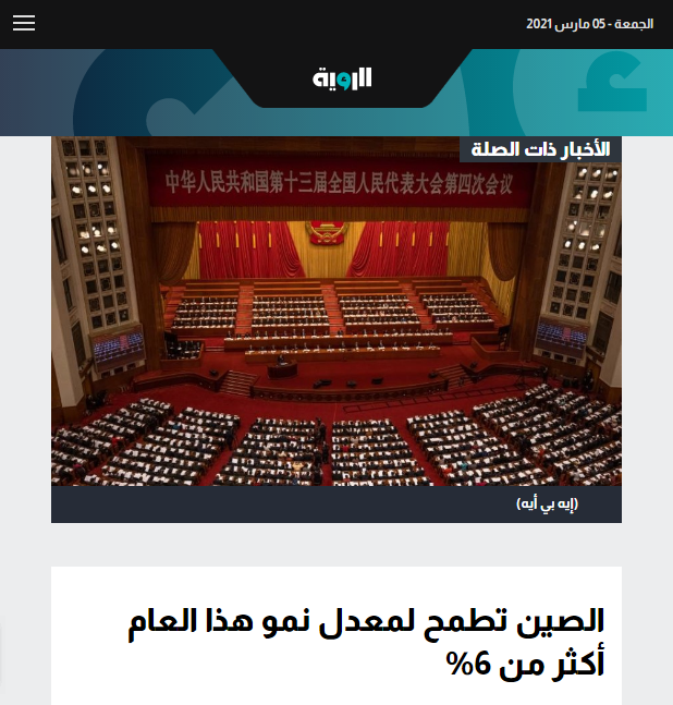 3月4日,中国两会启幕。2021年是中国共产党成立100周年,也是实施“十四五”规划、开启全面建设社会主义现代化国家新征程的开局之年。中国的经济发展与世界息息相关,中东多国媒体密切关注了中国2021经济增长目标、绿色发展、科技创新、脱贫等相关内容。