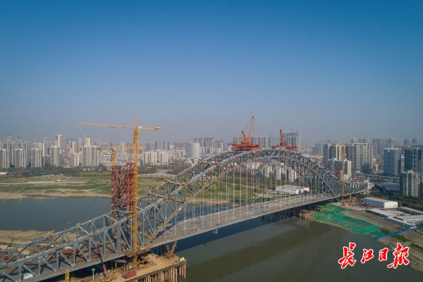 汉江湾桥建设现场 ,工人们正在紧张施工。 长江日报记者任勇 航拍