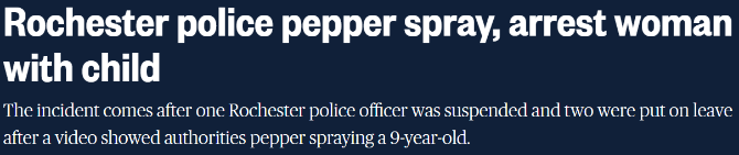 事实上,之前毫不出名的罗切斯特市在最近一年里已经因为频发的警察暴力执法事件而“名声大噪”。就在一个多月前,该市警察在处理一起家庭纠纷时,不仅给一名9岁非洲裔女童戴上了手铐,还用胡椒喷雾喷她的脸,引发舆论强烈谴责。